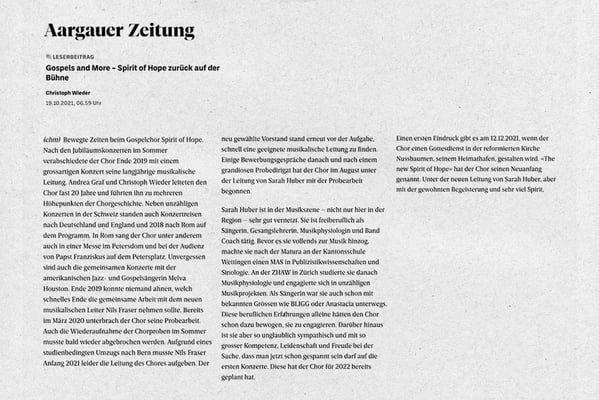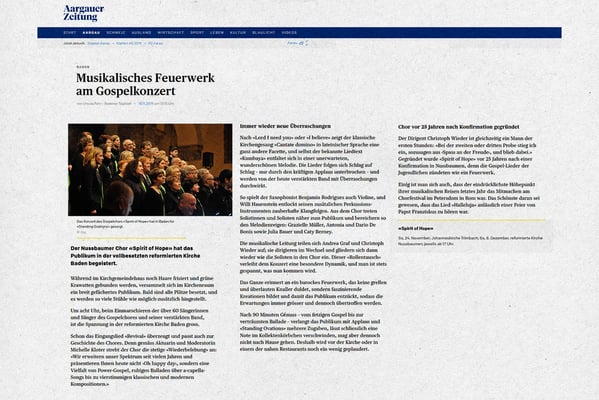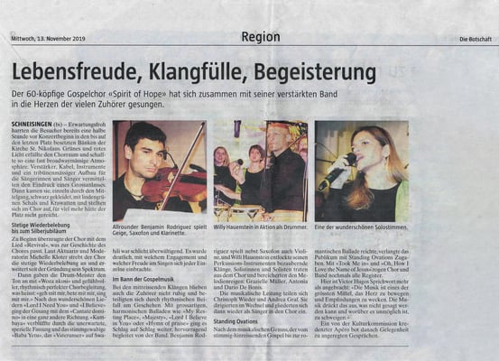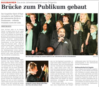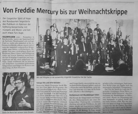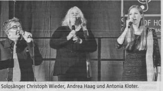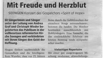 "Mit einer guten Mischung aus Gospel, Welthits und einigen Abstechern in den Jazz und die Klassik genossen die Besucher ein hervorragendes Konzert mit der neuen Dirigentin Joanna Skowronska. "